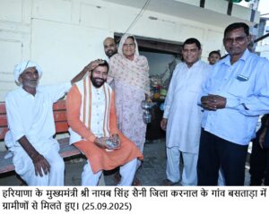 करनाल -हरियाणा के मुख्यमंत्री नायब सिंह सैनी की सादगी ने आज बसताडा गांव के लोगों को उस समय हैरान कर दिया जब उनका काफिला सड़क के बीच रूका, मुख्यमंत्री गाडी से नीचे उतर कर किराने की दुकान के सामने पंचायत द्वारा रखे सीमेंट के बैंच पर बैठ गए, ग्रामीणों से हाल चाल जानने लगे, उनके इस व्यवहार से ग्रामीण बहुत खुश हुए l