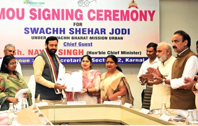 करनाल- करनाल के जिला सचिवालय सभागार में स्वच्छ भारत मिशन (शहरी) के तहत स्वच्छ शहर जोड़ी-समझौता ज्ञापन हस्ताक्षर समारोह का आयोजन किया गया जिसमें मुख्यमंत्री नायब सिंह सैनी ने बतौर मुख्य अतिथि शिरकत की। स्वच्छता के प्रति मार्गदर्शन के लिए करनाल नगर निगम की ओर से प्रदेश के 5 शहरों की नगर पालिकाओं के साथ एमओयू किया गया। केंद्रीय ऊर्जा, आवासन व शहरी कार्य मंत्री मनोहर लाल सोनीपत से वीडियो कांफ्रेंसिंग के जरिए देश की विभिन्न निकाय संस्थाओं से जुड़े और स्वच्छ शहर जोड़ी पर प्रकाश डाला।
