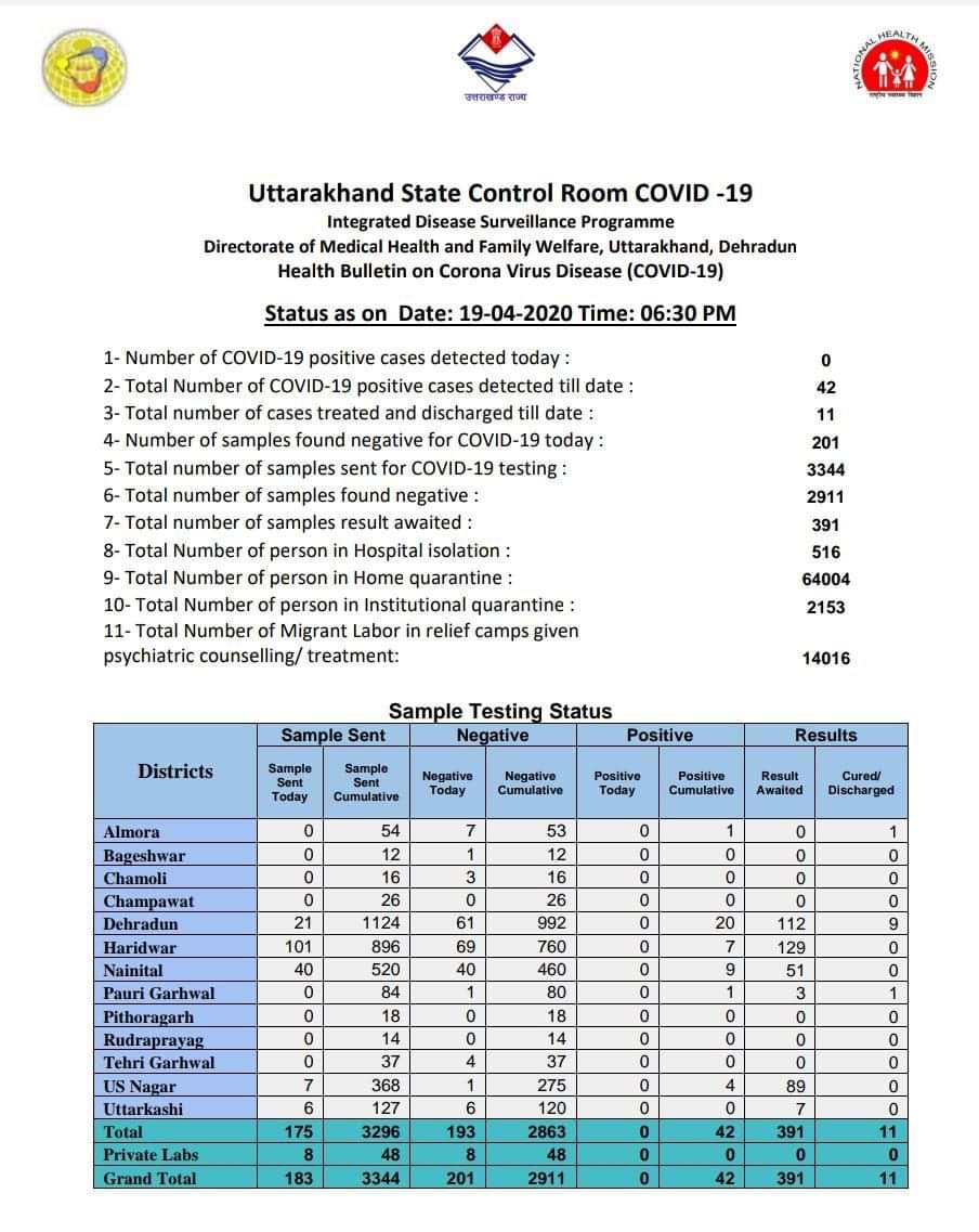 रिपोर्ट – कान्ता पाल/नैनीताल – राज्य सरकार ने जारी किया हेल्थ बुलेटिन अब तक 44 मरीजों  मे हो चुकी कोरोना की पुष्टि l देर शाम राज्य में 2 नए कोरोना पॉजेटिव मामले सामने आए हैं l दोनो मामले देहरादून के पश्चिम बंगाल के रहने वाले हैं l  दोनो संक्रमित राज्य में अब तक कुल 44 मरीजों में कोरोना की पुष्टि हो चुकी है उत्तराखंड में कोरोना के अभी कुल 33 एक्टिव केस हैं , अब तक 11 कोरोना पॉजिटिव मरीज ठीक होकर अस्पताल से डिस्चार्ज हो चुके हैं l  देहरादून- 22, हरिद्वार-7, ऊधमसिंह नगर-4, अल्मोड़ा-एक, पौड़ी-एक, नैनीताल-9 मामले आ चुके है सामने राज्य में आज कुल 201 मरीजों की रिपोर्ट सभी नेगेटिव आई है l