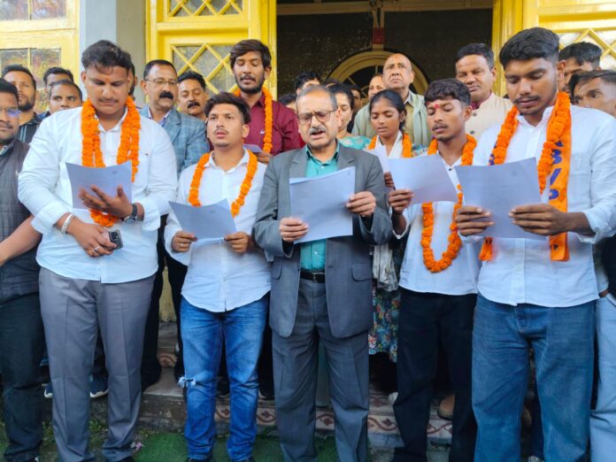 आज हुए छात्र महासंघ चुनाव में कुमाऊं विश्वविद्यालय के हार्मिटेज भवन के महिला अध्ययन केंद्र में सुबह दस बजे से 12 बजे तक नामांकन पत्रों की बिक्री गई है। जिसमें अध्यक्ष, उपाध्यक्ष, सचिव, उपसचिव, छात्रा उपाध्यक्ष और कोषाध्यक्ष पद के लिए नामांकन पत्रों की बिक्री की गई l जिसमें सभी पदों के लिए एक एक नामांकन पत्रों की बिक्री की गई l इसके साथ ही 11 बजे से एक बजे एक नामांकन प्रकिया की गई, जिसके बाद एक बजे से दो बजे तक नामांकन पत्रों की जांच की गई l जांच में सभी दस्तावेज़ सही पाए गए l चुनाव अधिकारी प्रो. नीलू लोधियाल ने बताया कि छात्र महासंघ में अध्यक्ष पद पर डीएसबी परिसर नैनीताल के आशीष कबड़वाल, उपाध्यक्ष पद पर, एमबीपीजी के रक्षित बिष्ट, छात्रा उपाध्यक्ष पद पर राजकीय महाविद्यालय गदरपुर की काजल, सचिव पद पर एनबीपीजी महाविद्यालय के सचिन सिंह सामंत, उपसचिव पद पर राजकीय महाविद्यालय बाजपुर के पीयूष, व कोषाध्यक्ष पद पर पीएनपीजी महाविद्यालय रामनगर के रोहित नेगी निर्विरोध चुने गए l उसके बाद अधिष्ठता छात्र कल्याण प्रो. संजय पंत ने अध्यक्ष समेत सभी पदाधिकारियों को पद व गोपनीयता की शपथ दिलाई l चुनाव प्रकिया को सफल बनाने में प्रेक्षक प्रो. डीएस बिष्ट, प्रो.ललित तिवारी, प्रो. गीता तिवारी, प्रो. सुषमा टम्टा, प्रो . अमित जोशी, डॉ. गगन दीप होती, डॉ. आरसी जोशी, डॉ. अशोक कुमार, डॉ. आशीष तिवारी, डॉ. दीपिका पंत, डॉ. निधि वर्मा, डॉ. नवीन पांडे, डॉ. नंदन मेहरा, डॉ अमित मलकानी, डॉ. सीबी जोशी, गणेश, सहित कुलानुशासक टीम प्रो. एच सी एस बिष्ट, डॉ. हिमांशु लोहनी, डॉ. पी एस अधिकारी, डॉ. मनोज बिष्ट गुड्डू, डॉ मोहित रौतेला, डॉ महेश आर्या, आदि मौजूद रहे l