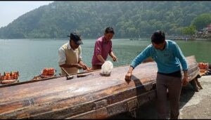 रिपोर्ट -कांता पाल/नैनीताल – पर्यटन सीजन के दौरान नैनीताल व् आसपास की झीलों में नौकायन का आनंद उठाने वाले पर्यटकों के लिए यहाँ के नाविक जोर शोर से नाव(बोट)निर्माण की तैयारियों में जुटे हुए हैं। आइये हम आपको बताते है की जिस रोविंग बोट (चप्पू बोट) में आप सफर कर नैनीझील की सैर करते हैं वो आखिर बनती कैसे है। वर्षों से नाव बनाने की कारीगरी से जुड़े 50 वर्षीय नैनसिंह चौहान के अनुसार रोइग बोट तुन और शीशम की लकड़ी से बनती है। अपने हलके वजन के साथ साथ ये लकड़ी पानी में आसानी से खराब नहीं होती है। बोट के फ्रेम में तांबे की कीलों को ठोककर उसे मजबूत बनाया जाता है और पानी में काम करने के कारण तांबे की कील जंक से भी बचाती है । फ्रेम बनाने के बाद लकड़ी को अलसी का तेल पिलाते हुए दो दिनों तक उसे सुखाया जाता है। नाव में इसके बाद पोटीन से चारों तरफ की दरारों को अच्छी तरह से भरा जाता है। पोटीन के सूखने के बाद नाव में सिंथेटिक वार्निश से पॉलिश किया जाता है। इससे नाव में स्थिरता और मजबूती आती है। नाविक समेत पांच लोगों को घुमाने वाली इस नाव की सुरक्षा के लिए सभी महत्वपूर्ण इंतजाम किए जाते हैं।